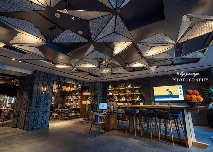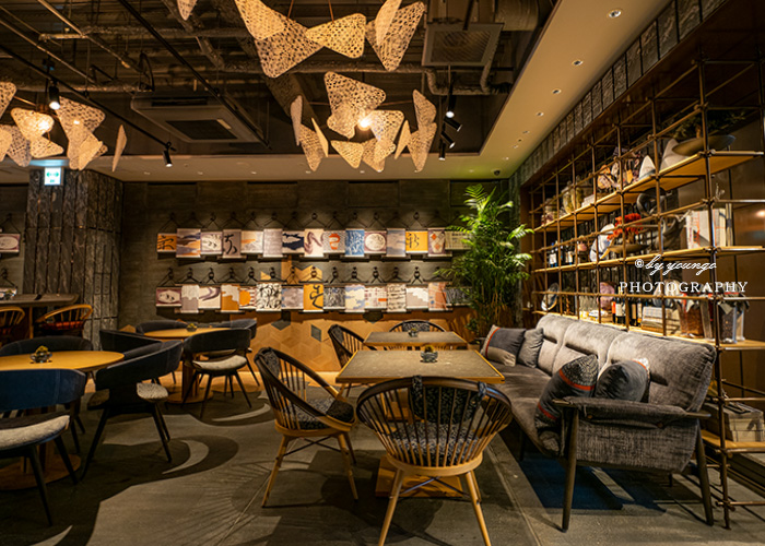 B1F ラウンジではこの雅楽のコンセプトのもと、「雅楽楽器のオブジェ」、「平安モチーフ」、「玩具」、「装飾用文学書」、「装飾用和綴じ本」、「読む本」の6つのテーマを融合し、心に残る魅力的なライブラリー空間を演出しています。