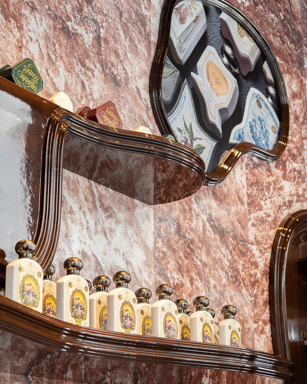 インテリアもこだわりも強くて、神戸牛をイメージした大理石やチョコレートが溶け出したような棚も神戸のイメージに合わせて特注したもの◎